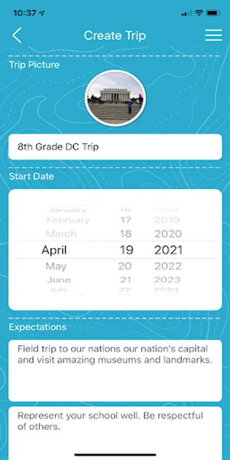 Create a trip. Start with this. Enter the name of the trip, start date and duration and just like that you're ready to roll. Include a brief “purpose of the trip” and “code of conduct” if you choose.