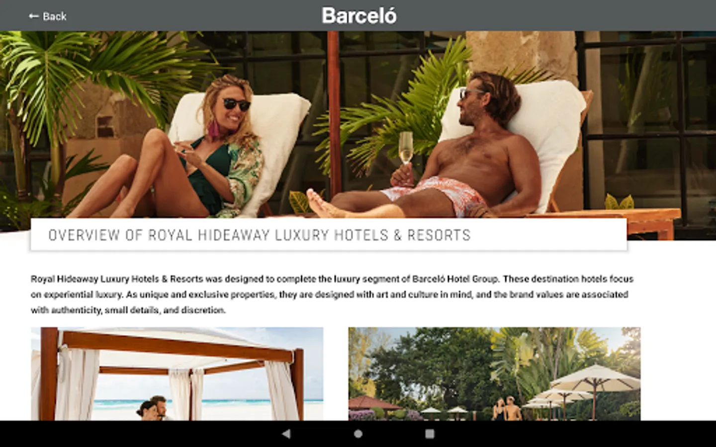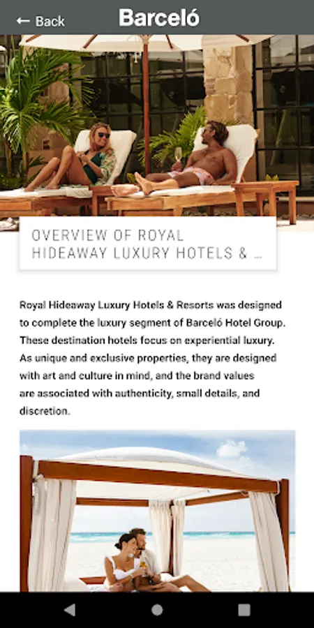 On behalf of Barceló Hotel Group, welcome to the Barceló Hotel Group Mobile Sales Companion. This mobile app has been designed to help you easily discover and sell Barceló like a pro, anytime or anywhere – helping maintain your expertise. The content is all-new, updated regularly, easily sharable, and has something for everyone. Explore our brands, experiences, resources and learn more about planning the dream wedding with Barceló Hotel Group. Enjoy!