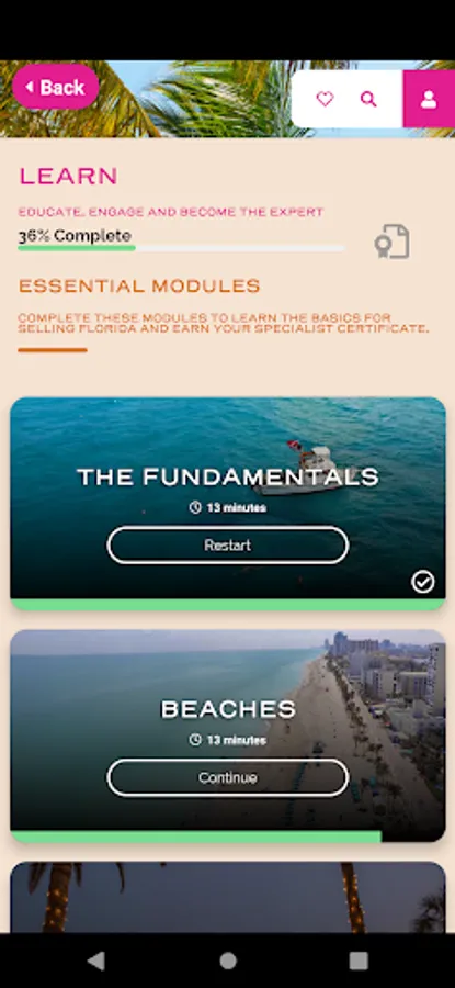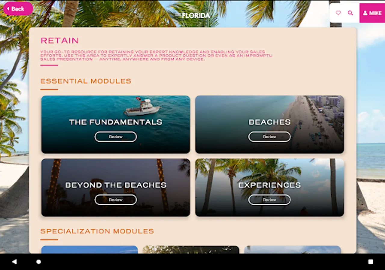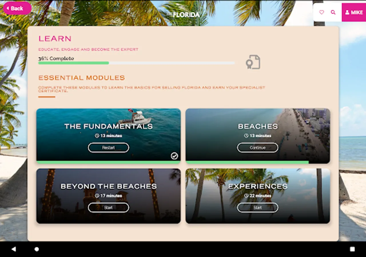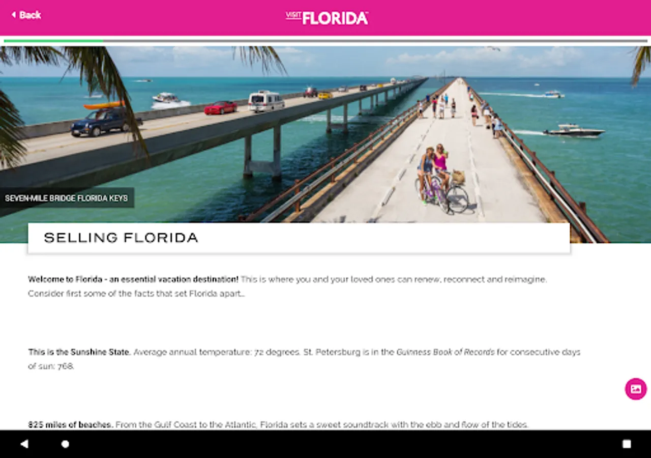 On behalf of VISIT FLORIDA, welcome to the VISIT FLORIDA Training Program and Sales Companion. This mobile app is designed to help you more easily discover and sell Florida like a pro, anytime or anywhere – helping maintain your expertise long after completing the embedded VISIT FLORIDA training course.