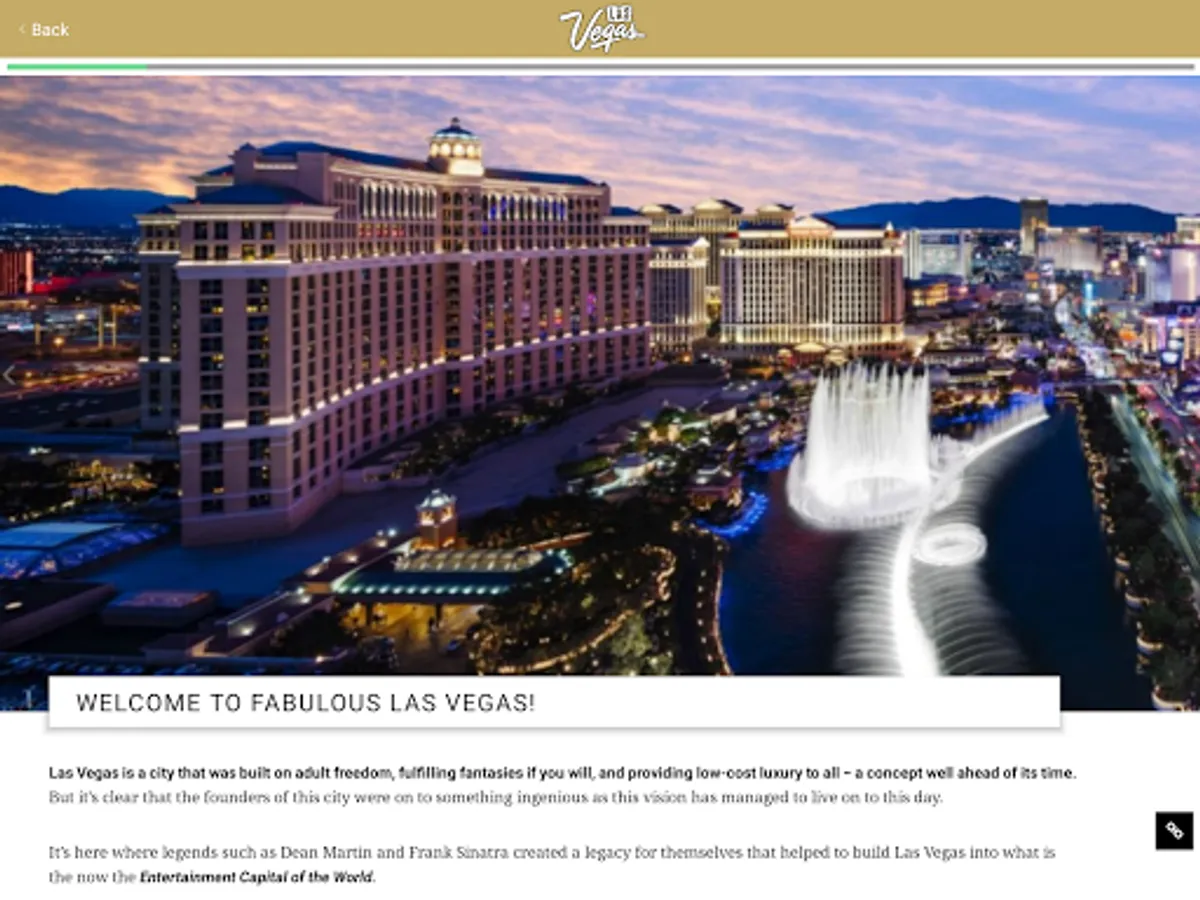 On behalf of the Las Vegas Convention and Visitors Authority (LVCVA), welcome to the Las Vegas Learn & Earn Program. This mobile app is designed to help you more easily discover and sell Las Vegas like a pro, anytime or anywhere – helping maintain your expertise long after completing the embedded training course. The content is all-new, updated regularly, easily sharable, and has something for everyone. In addition to the destination content, enjoy the interactive Hotel Directory and explore product throughout the city to expand your understanding of what’s new, exciting, and available for you. Be sure to tap around the Promote and Sell tabs for easily shareable media and assets. Tap on My Rewards to take advantage of the various booking opportunities!