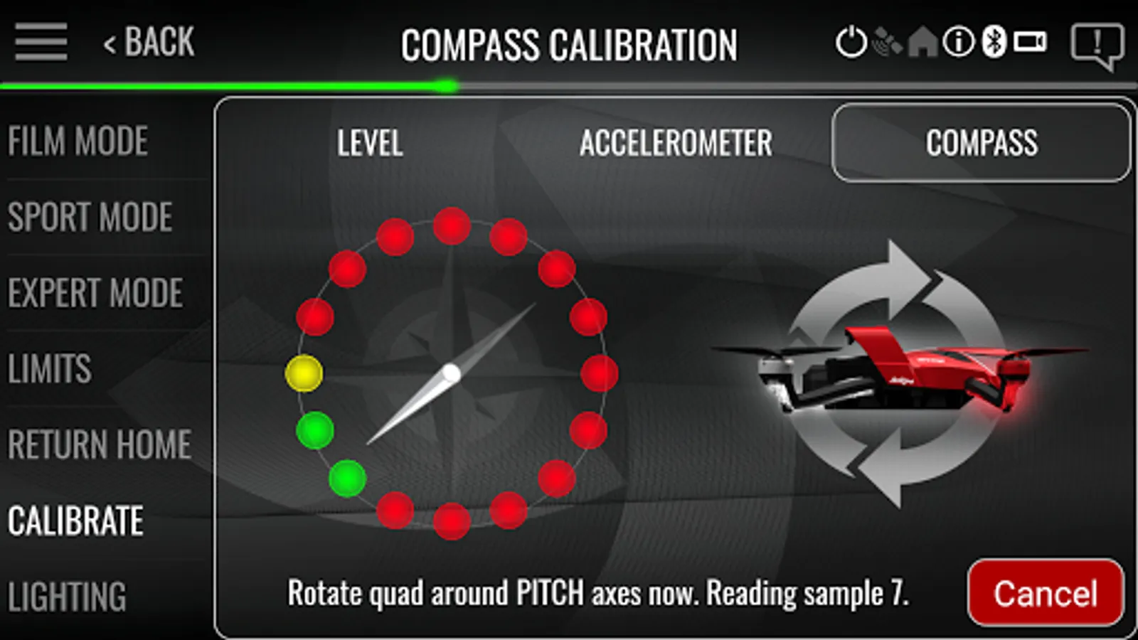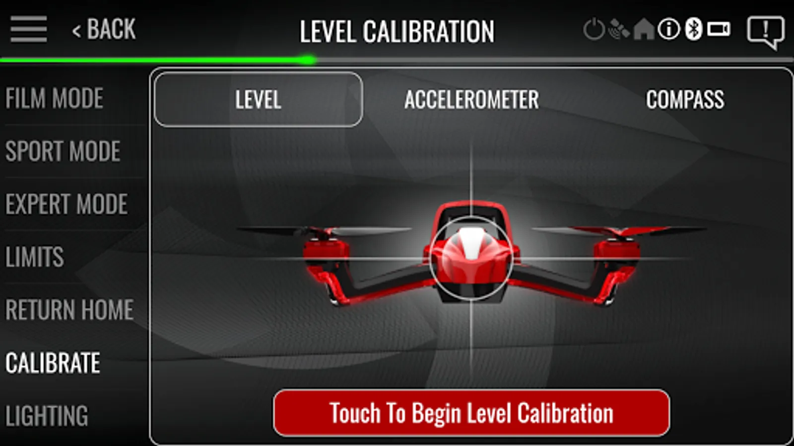 The Dashboard screen lets you see live data from Aton. This includes speed, altitude, latitude and longitude coordinates, and battery status.* View the Flight Ready status and connection from the Home screen. Access Aton’s settings via the Controls/Settings button. Here you will find adjustments for Film, Sport, and Expert Modes, the Geofence radius and ceiling limits, Return to Home Altitude, calibration for Aton, turn lighting on/off, and access the transmitter settings.