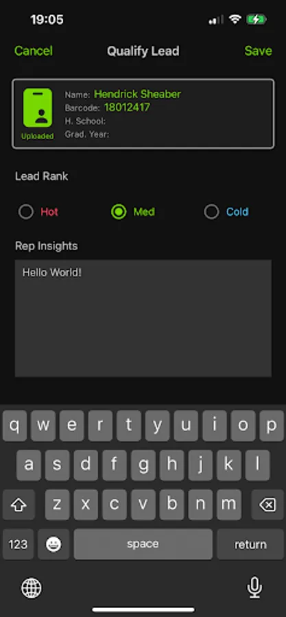 - Add notes to a student profile - reps have the ability to add any pertinent notes from the conversation to aid in the follow up later (must be done before the next student is scanned)