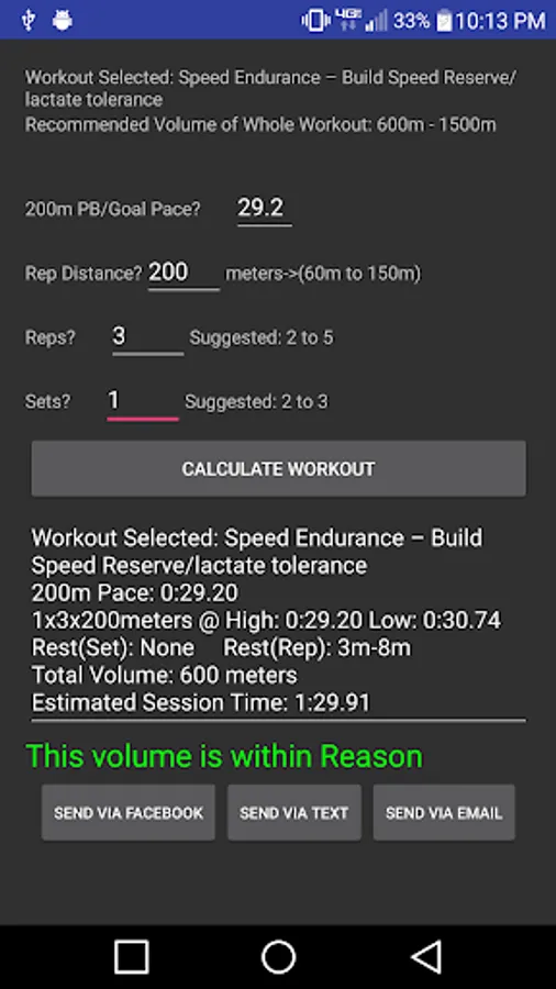 4. Hit calculate and receive a full workout description with paces/rest/duration/volume recommendation