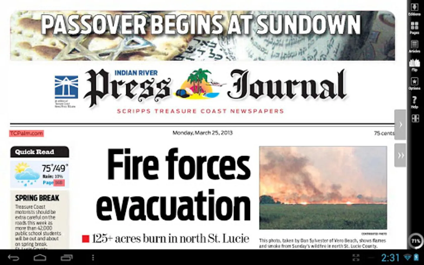 The IRPJ electronic newspaper lets you read the Indian River Press Journal on your Android device just as it appears in print. You can flip through pages and skim headlines as you would in the printed edition. Better than that, the IRPJ electronic newspaper allows you to enlarge type with the tap of a finger, or jump instantly to the conclusion of a story on another page. You can link to websites mentioned in stories with a single touch, or send an e-mail to an address linked from the newspaper. If you missed the paper one day, don't worry. The IRPJ electronic newspapers lets you download past editions, too. An active subscription is required to view the app.