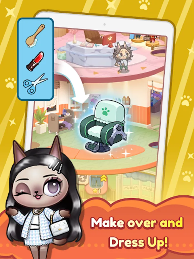 Summer is in full swing, and the cats are ready to party! In this idle tycoon game, you're the manager of a popular cat salon, and it's your job to make sure your furry customers are looking their best. Wash, dry, cut, and style their hair, and then give them a makeover with makeup, clothes, and accessories.