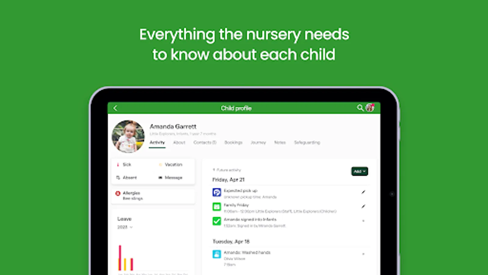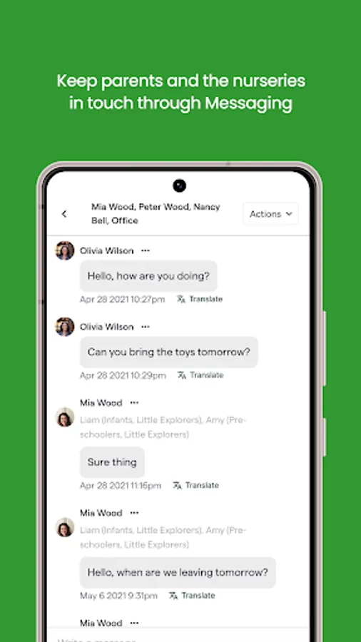 3. Messaging and Communication: The app facilitates direct and secure messaging between parents and the school. This allows parents to easily communicate with the school, ask questions, provide instructions, or discuss any concerns related to their child's care.