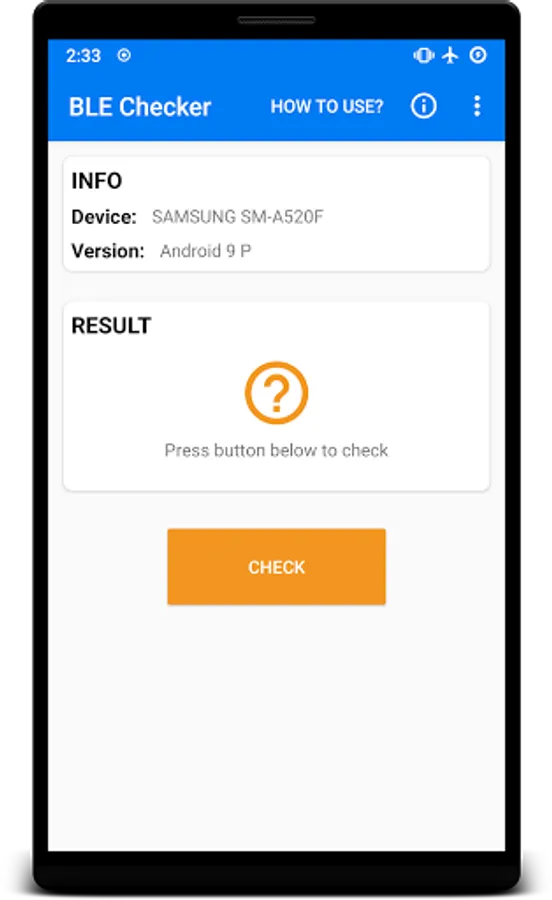 This is application can help you check if your device supports Bluetooth low energy (BLE) by one click. Notice result box, it will appear result after check in here.