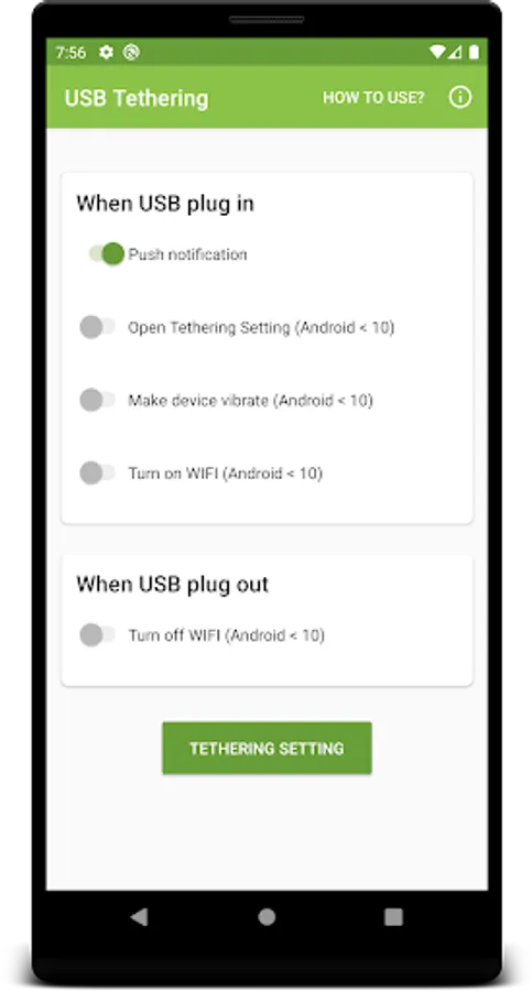 ✓Auto open USB Tethering setting, turn on WIFI, make notification, vibrate when plugin USB cable.