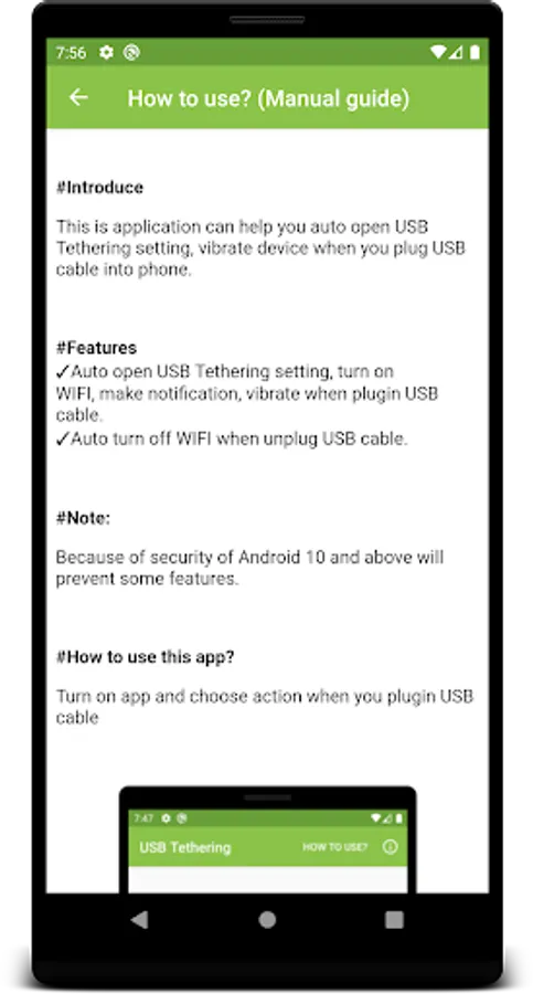This is application was designed auto open USB Tethering setting, vibrate device...etc when you plug or unplug USB cable.