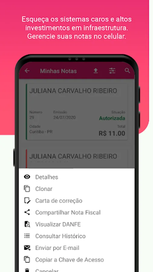 To make your daily life easier, Resulka allows you to issue banknotes directly from your cell phone, both banknotes for consumers (NFCe) and banknotes for other companies (NFe).