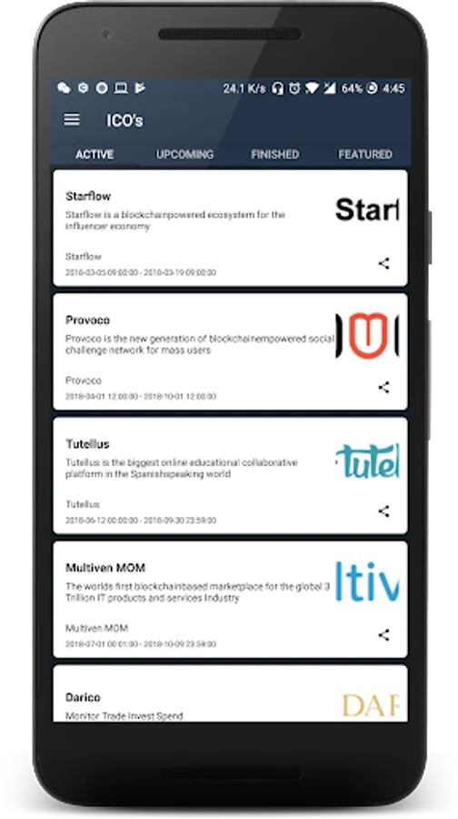 - Ongoing/upcoming/featured/finished ICO's listing added