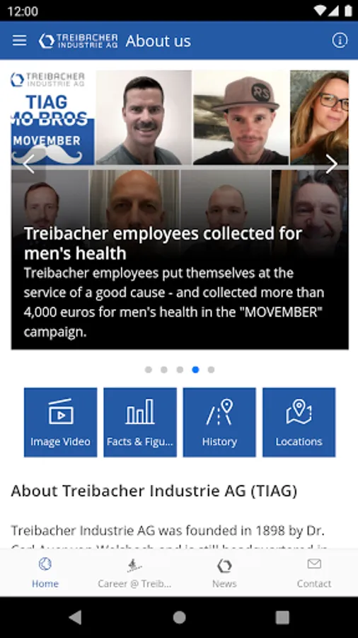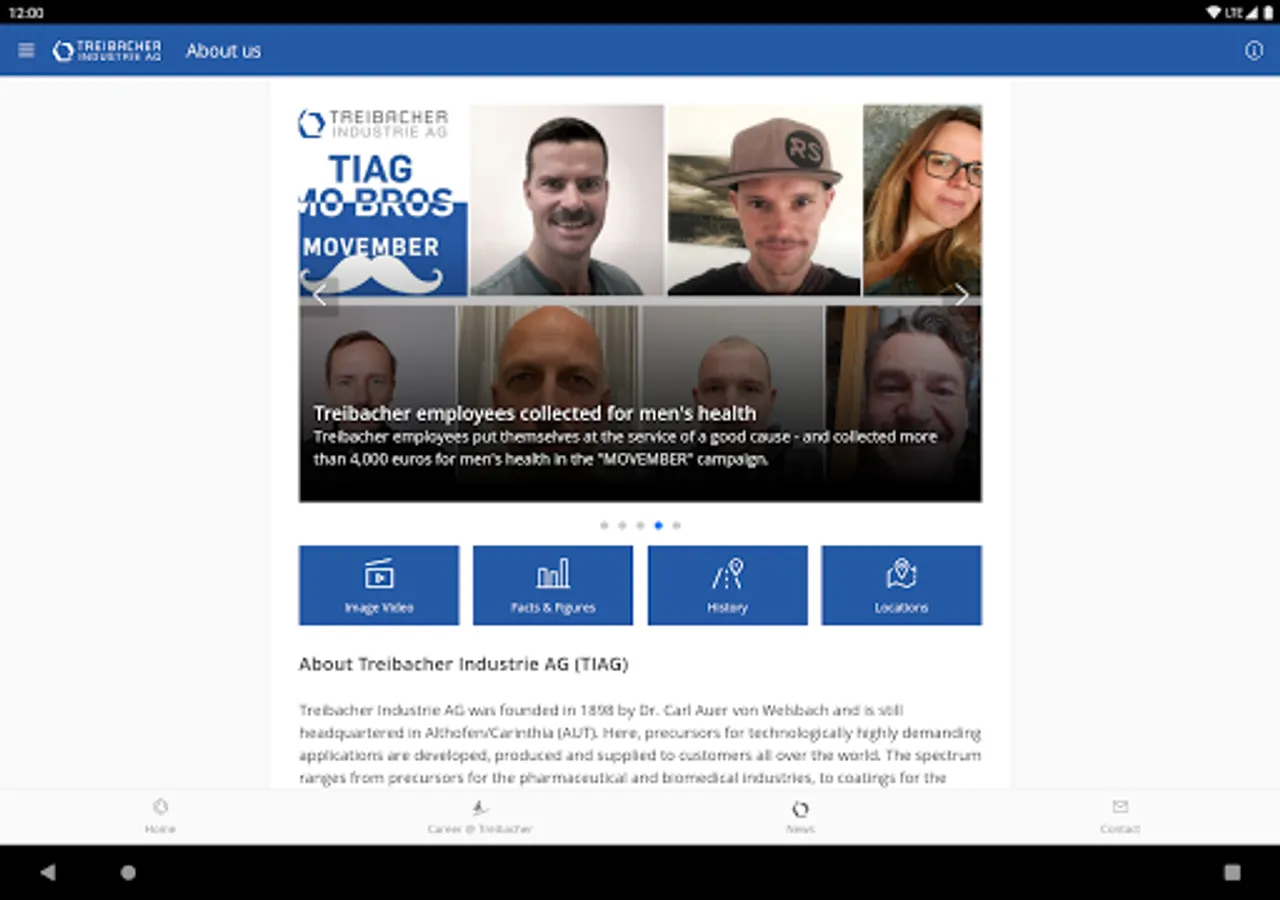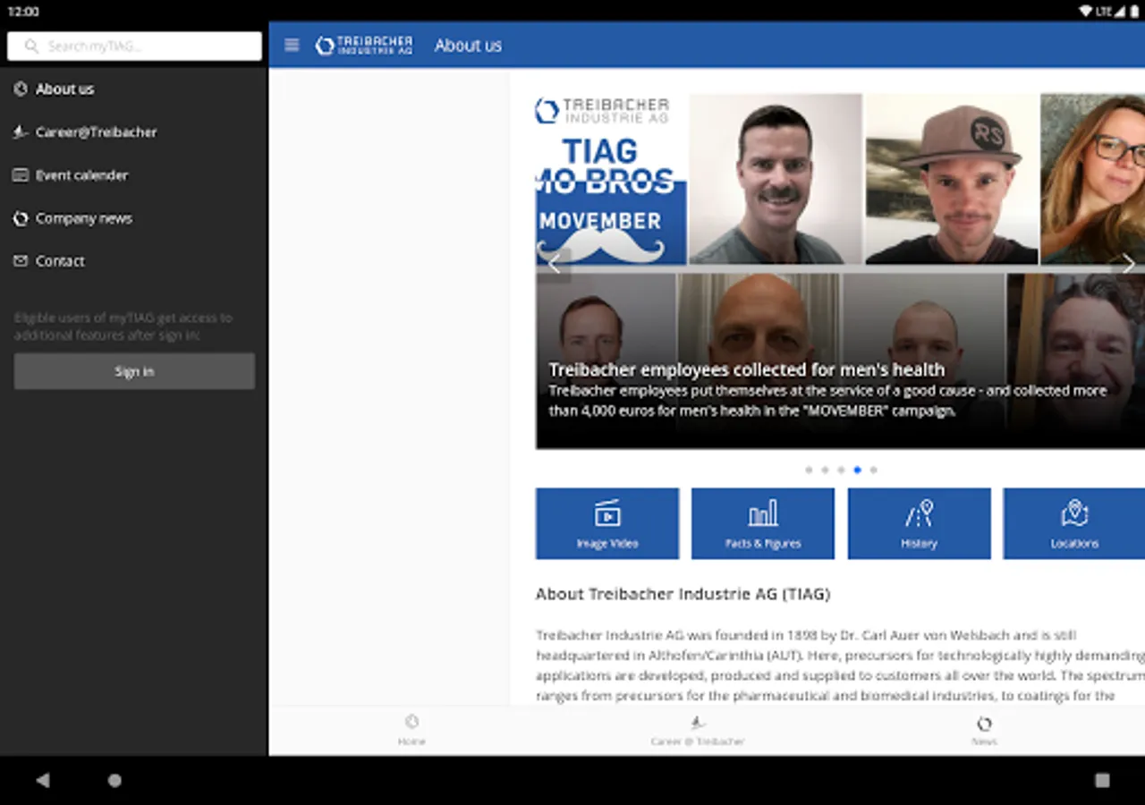 Treibacher Industrie AG is a globally operating industrial company with headquarters (production, sales, research & development) in Althofen/Austria. The myTIAG app offers customers, suppliers, partners and (potential) employees all relevant information and news about the company as well as career opportunities at a glance. Additional features such as an event calendar and a social media wall allow further insights into the company.
