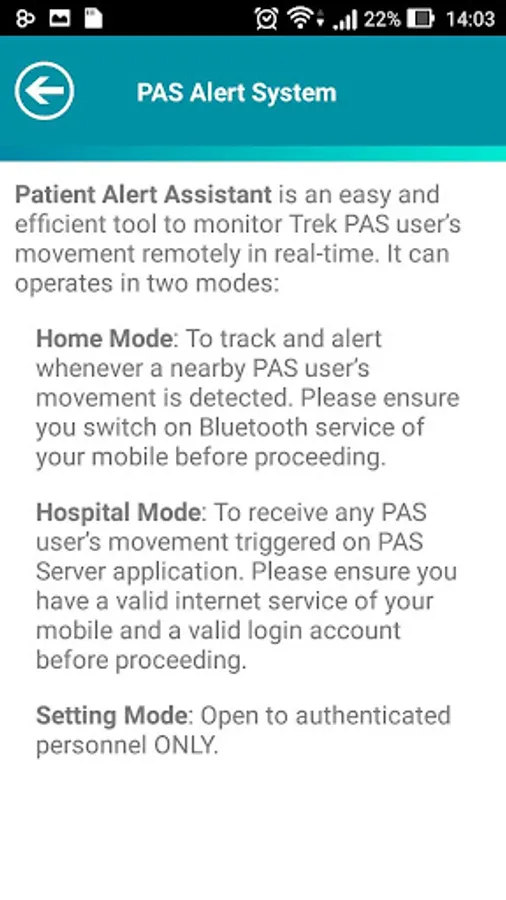 Patient Alert Assistant can trace all of Trek 2000’s Patient Alert System (PAS) devices’ activities and report to user readily. It provides two modes to cater user’s different needs: Home mode allows caretaker to monitor PAS directly using Bluetooth Low Energy (up to 70m); Hospital mode allows caretaker to monitor multiple devices remotely through designated terminals (PC or Trek 2000’s SmartGateway). Authorized users can edit sensitivity and notification intervals of PAS in Setting Mode.