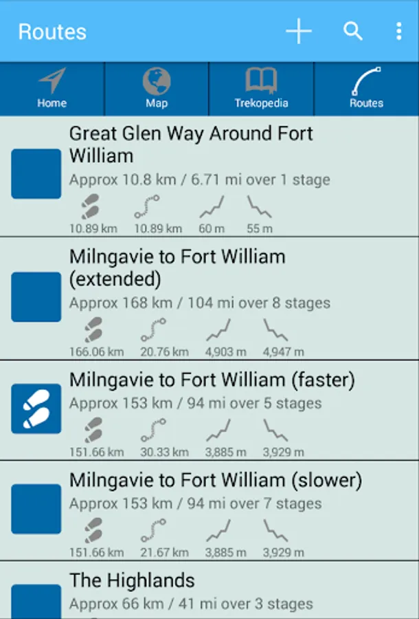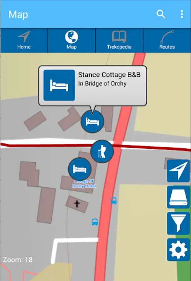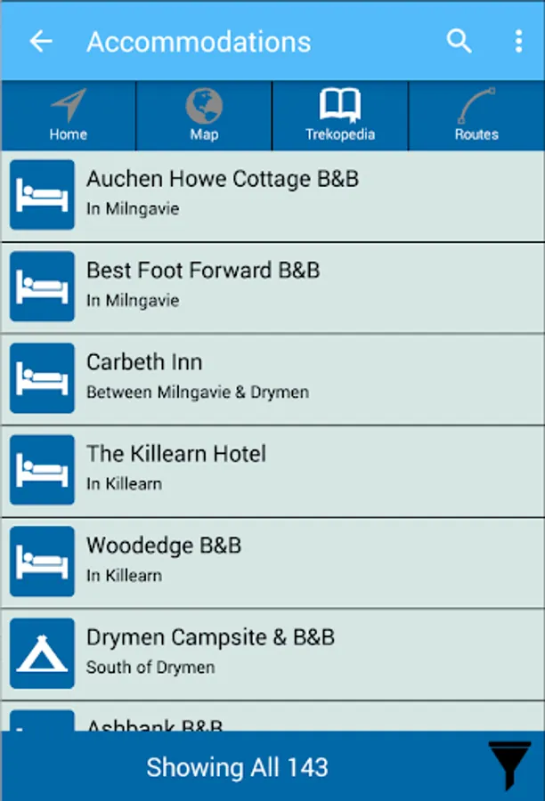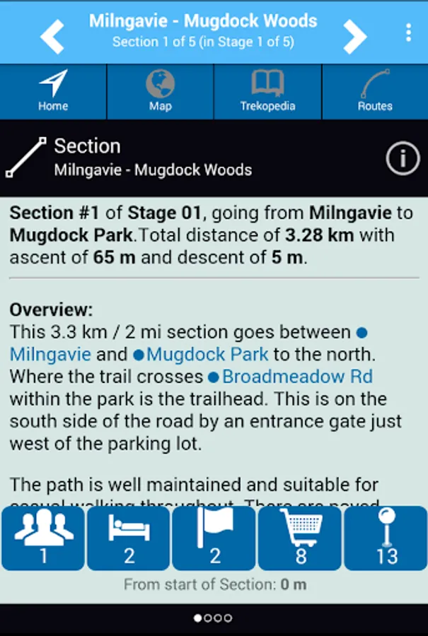 Location-aware information – TrekRight provides you with information tailored to your current location. If you are approaching Drymen, TrekRight will tell you how far you still have to go, what points of interest are available around you, where you can find a pub, options for where to stay the night, easy access to interactive elevation profile charts, and clear, detailed directions. You can easily see what things you flagged as interesting, which things you added notes to, and which you marked as favourites. Real-time information that keeps you completely on top of things!