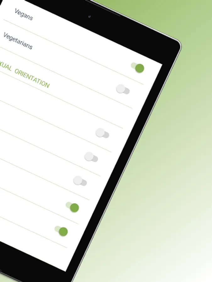 - Filter profiles for age, gender, sexual orientation, distance, and diet