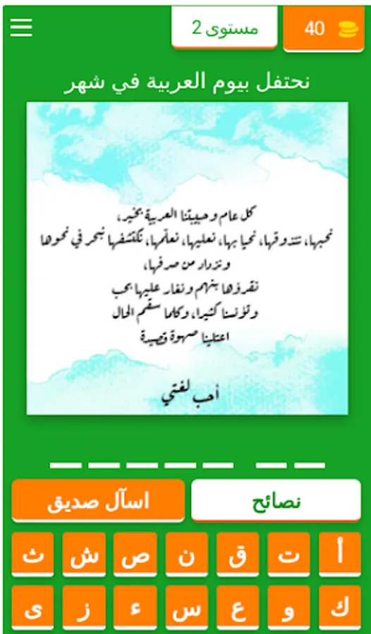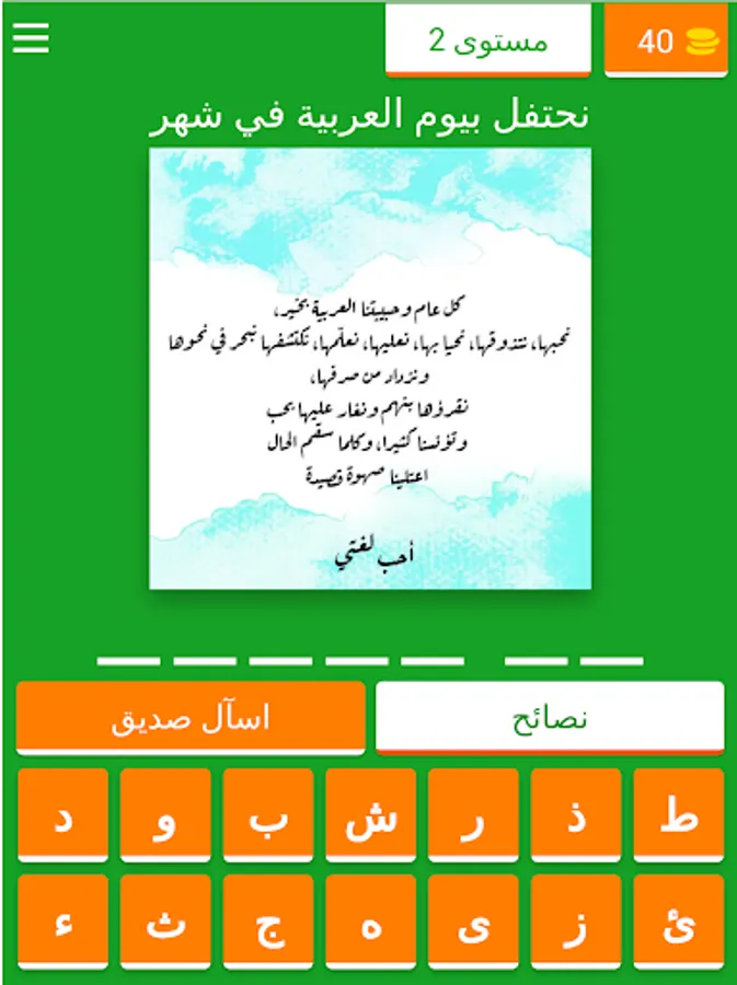 I love my language, one of the best puzzle games in the category (word search and guessing), the most fun and challenging for lovers of the Arabic language, it improves thinking skills, and activates the mind and memory.