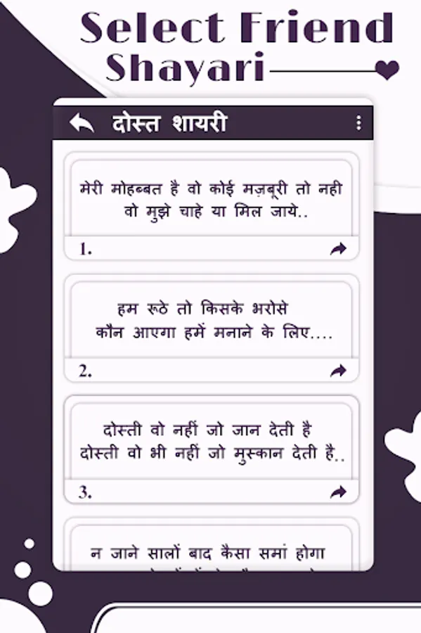 Share Romantic, Funny, Attitude, Friend, Love, Birthday, Good night, Good morning, Best Wishes, Memories, God, Navratri, Ganesha, New Year, Christmas, Kite, Republic Day, Valentine Day, Holi, dosti Shayari with your friends and family members.