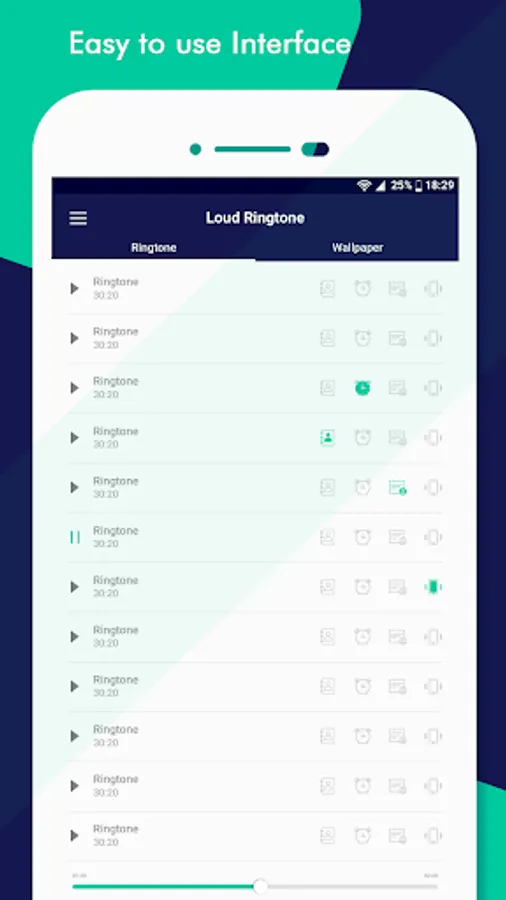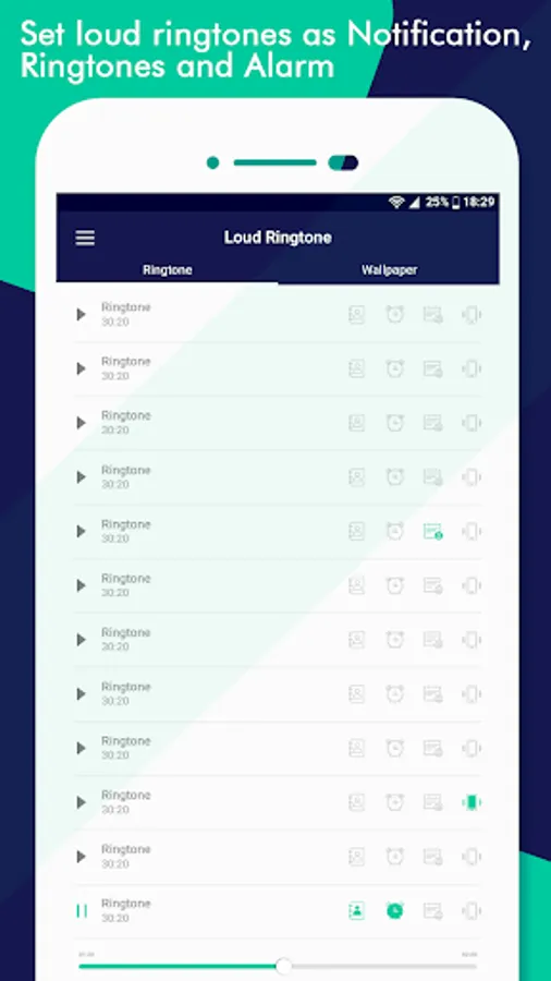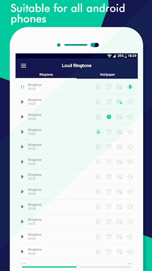 Open this free ringtones application, you can press the “play " button to listen to the MP3 music tones.