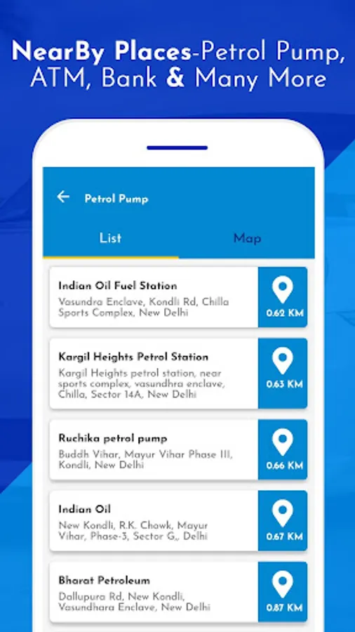 ♠ You can search Nearby places like Petrol Pump, Car Wash, Car repairing, Bus Station, Police Station, Railway Station, Hospitals, Banks and much more