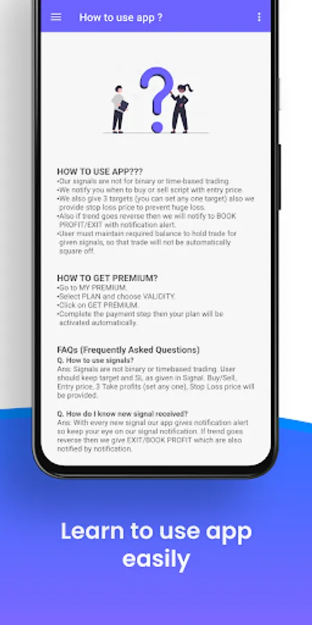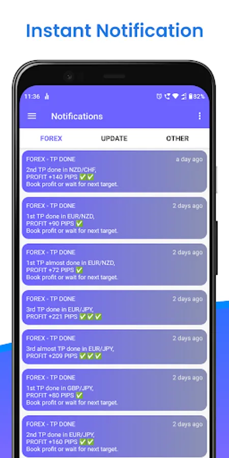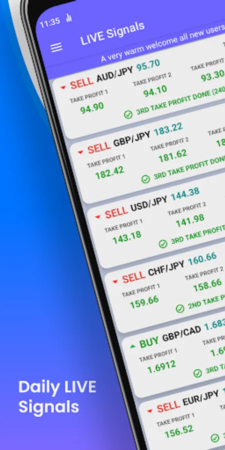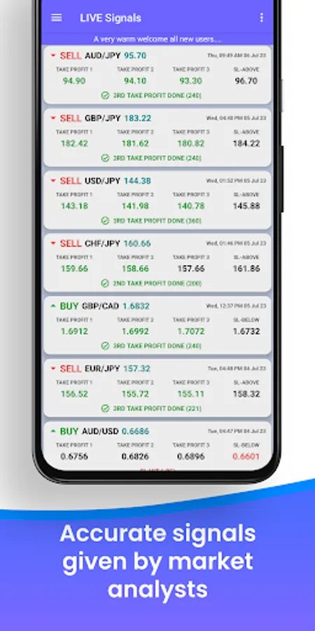 We provide long-term signals which may continue for a few days. BUY/SELL, Entry price, 3 Take Profits (you can set at any one of them), Stop loss price. All information will be provided to place trade. Simply follow our signals as given in the app.