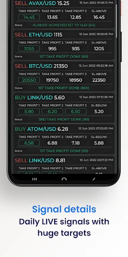 Get High quality signals generated by our analyst team. We provide signal of all the leading cryptocurrencies as list is given below. Each Signal includes 3 TAKE PROFIT & SL.