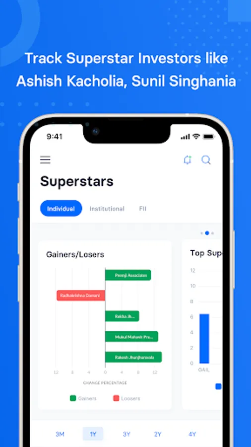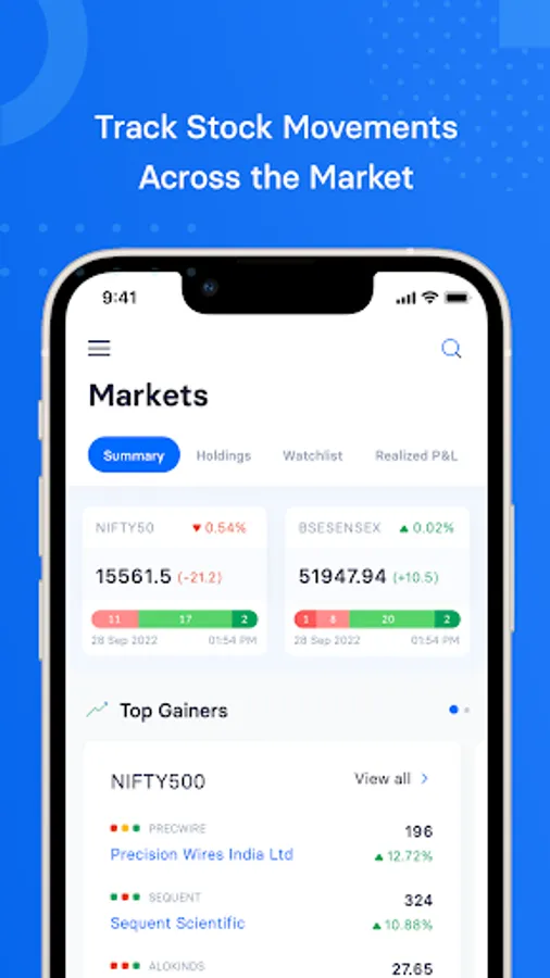 Keep track of price feeds, technicals, SMA/EMA, delivery and volume, insider trades, bulk block deals and more. Quickly find out all the major movements in the market. Add stocks to your watchlists and alerts to track them easily.
