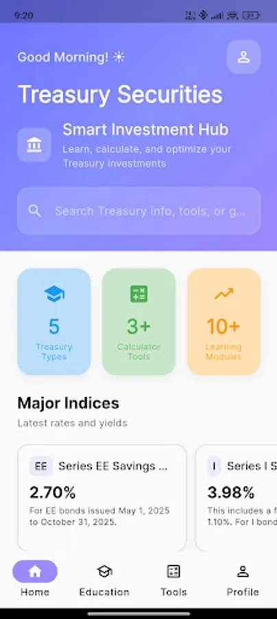 Whether you’re learning about treasury instruments, tracking market indices, or comparing investment outcomes, this app brings clear education, timely market information, and practical tools together in one place.