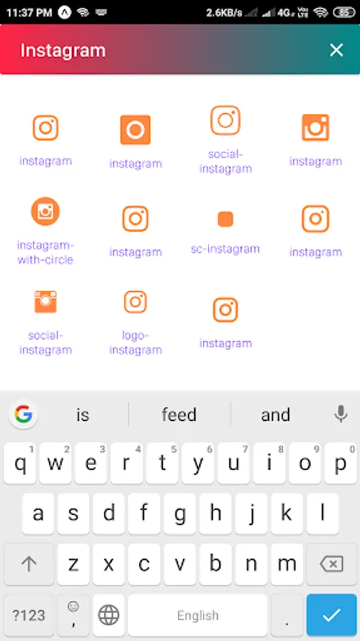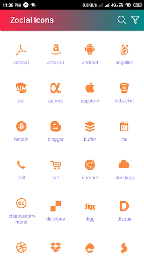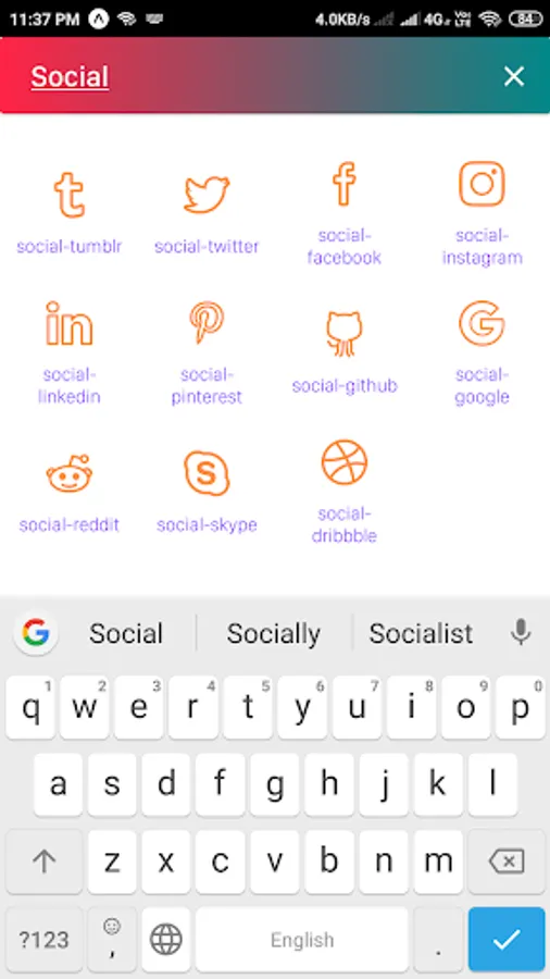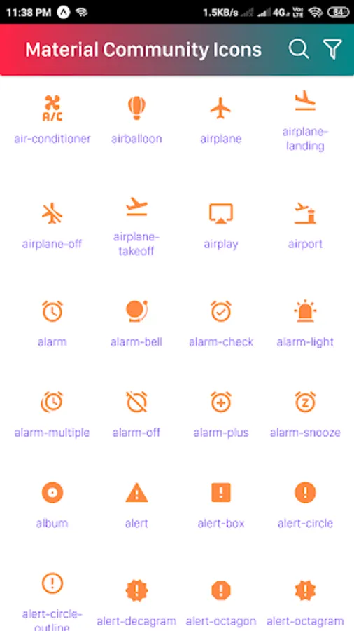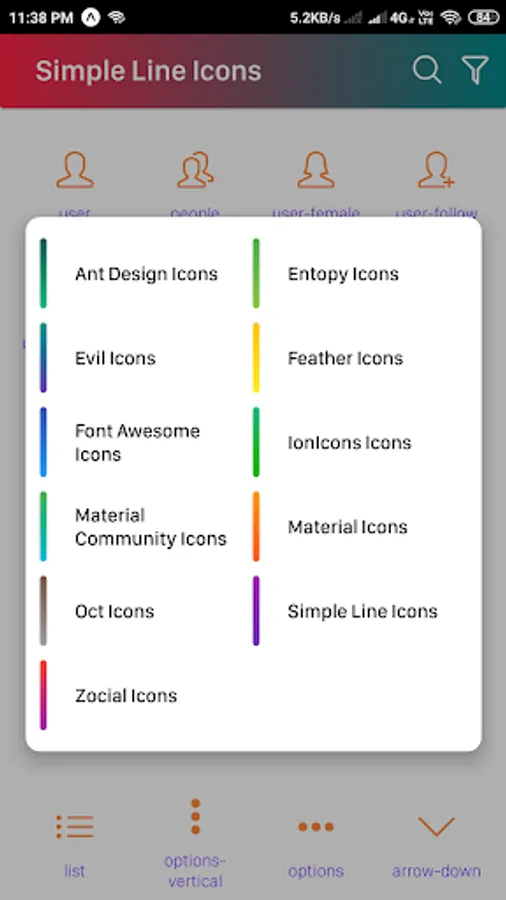 Font Awesome, Entopy, Material Community Icons, Material Icons, EvilIcons, Ionicons, Ocicon, Feather Icon, Simple Line icons and Zocial Icons are available to view