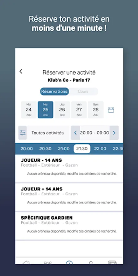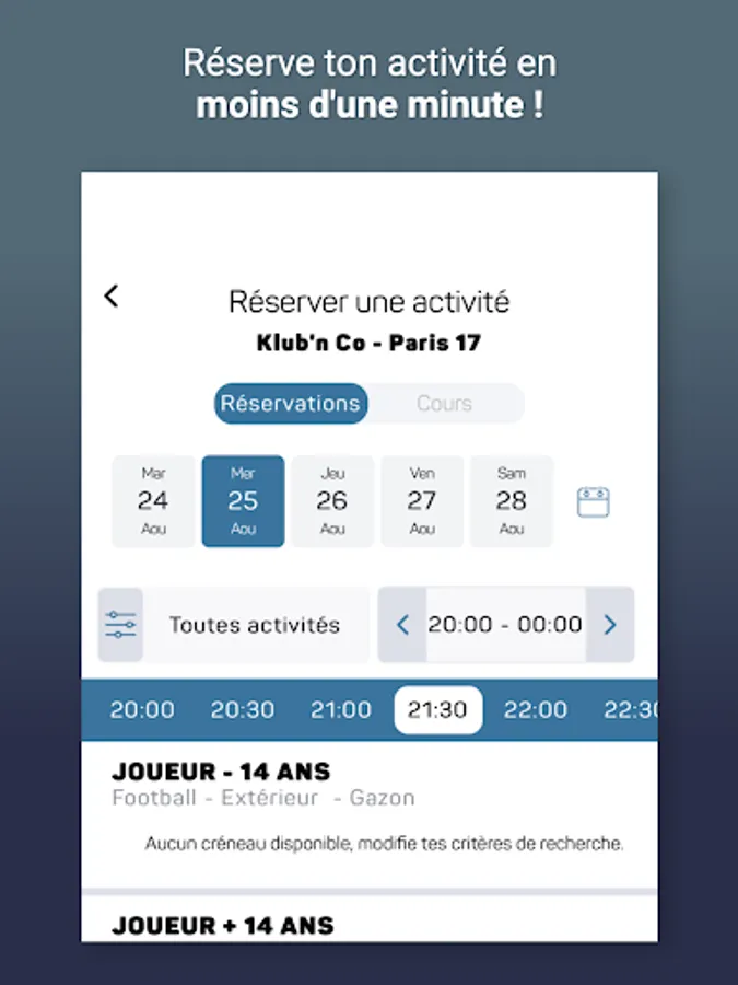 No more booking chore! With the application you just have to access the available slots and choose one. The club will then automatically receive your reservation.