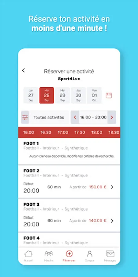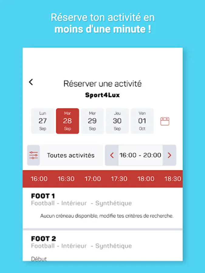 Fini la corvée de réservation ! Avec l'application tu n'as plus qu'à accéder aux créneaux disponibles et à en choisir un. Le club recevra alors automatiquement ta réservation.