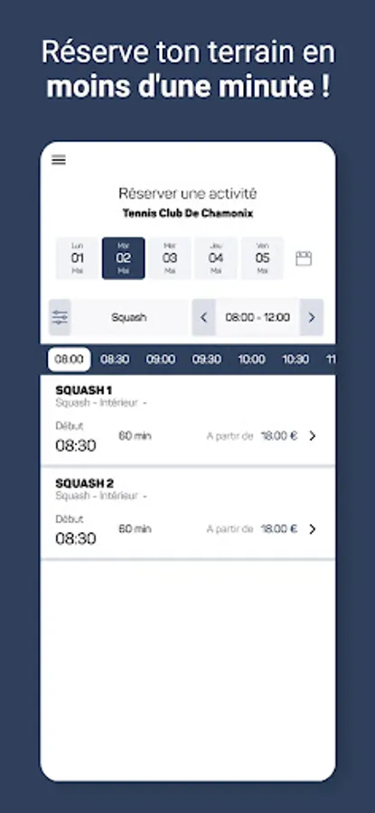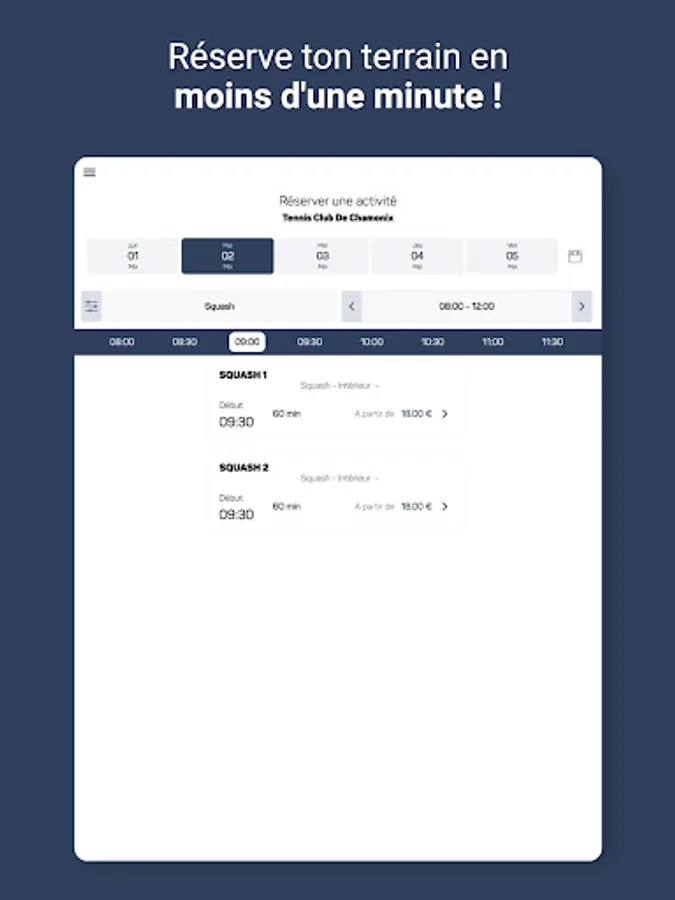No more booking hassle! With the application you just have to access the available slots and choose one. The club will then automatically receive your reservation.