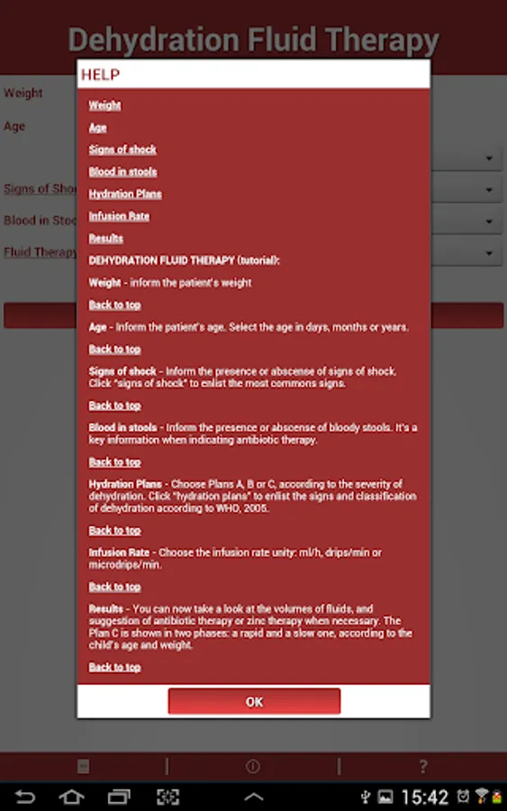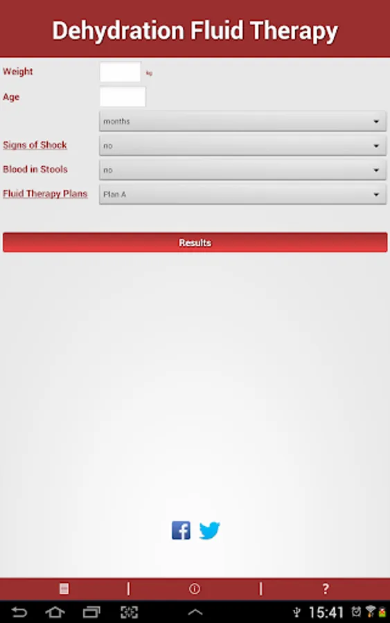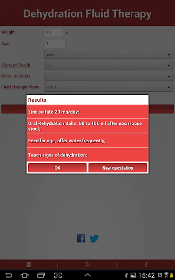 Our calculator provides doses of oral rehydration salts, zinc sulfate and volumes of fluid according to age and weight of the patient and degree of dehydration.