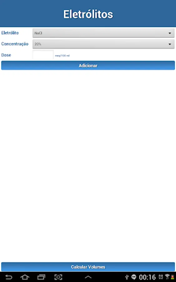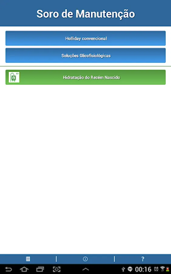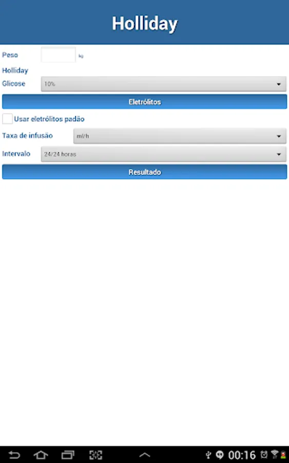 Maintaining venipuncture is based on the universally accepted rule of Holliday-Segar. The application allows the user to calculate the venipuncture in a conventional manner, or using mixtures of glucose solution 5% and physiological, according to the guidelines of most pediatric schools in Brazil and the world.