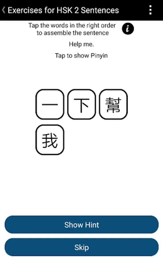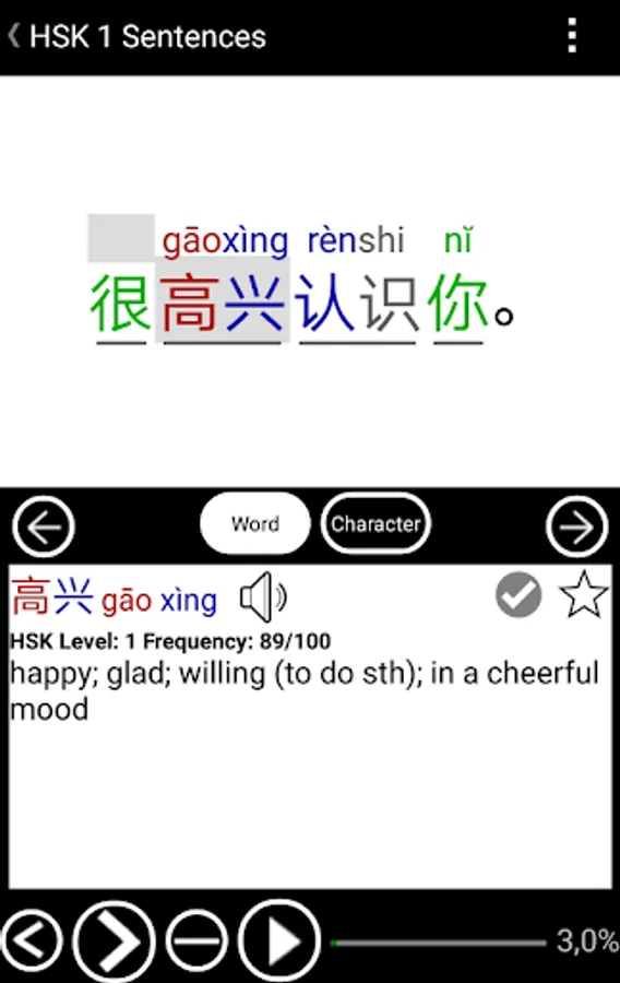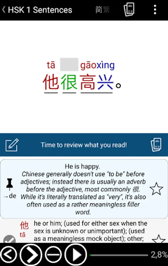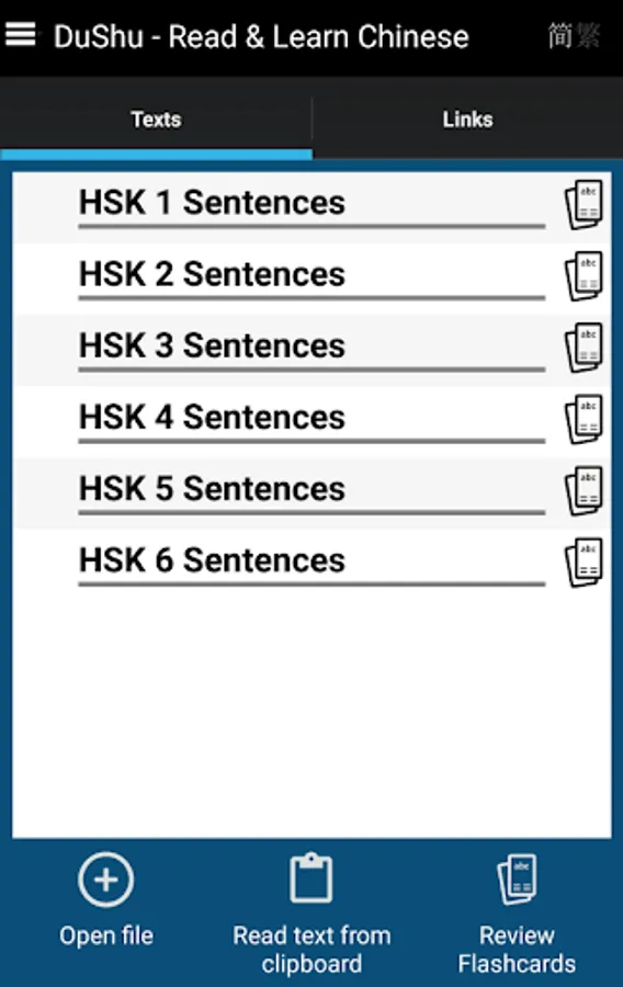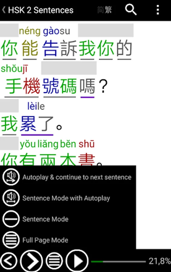 You can read sentence by sentence, with a vocabulary list below the text, or Chinese text only with the vocabulary on a separate page. The vocabulary list shows only relevant vocab according to your skill level. Words you already know can be removed from the list, the app also keeps track of your known words and will not show known words in vocab lists again.