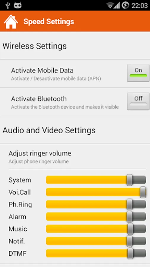 In this module you can enable / disable data traffic, you can activate the bluetooth and make it visible in one touch, you can adjust the different volume levels, etc.