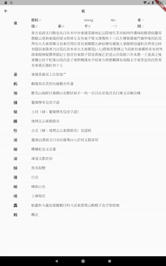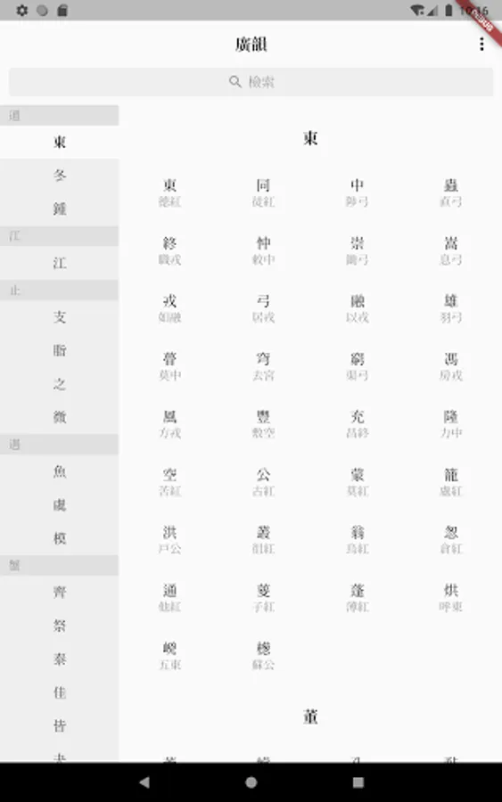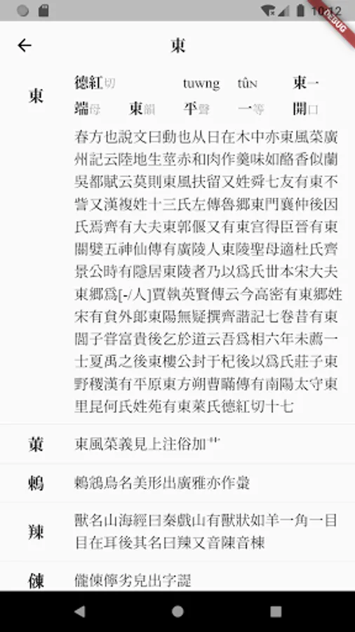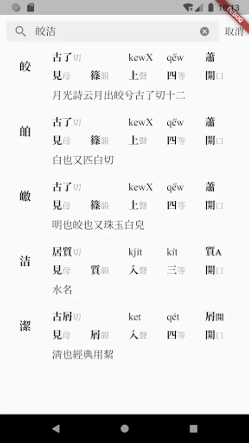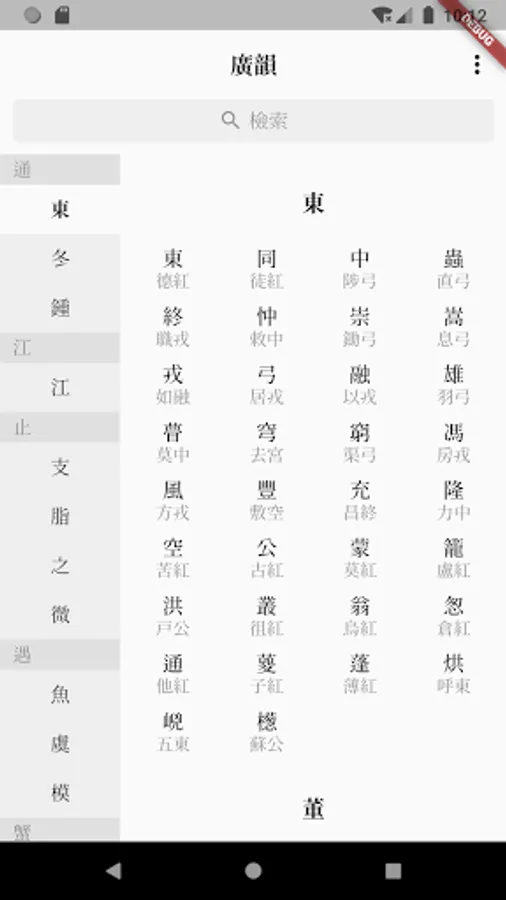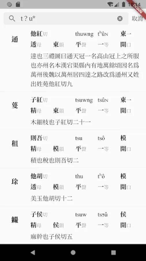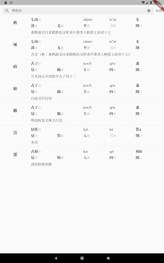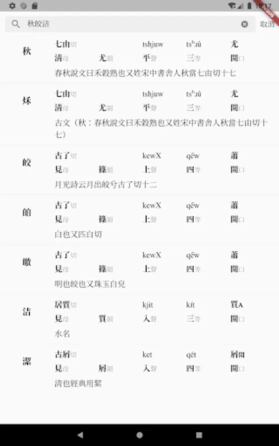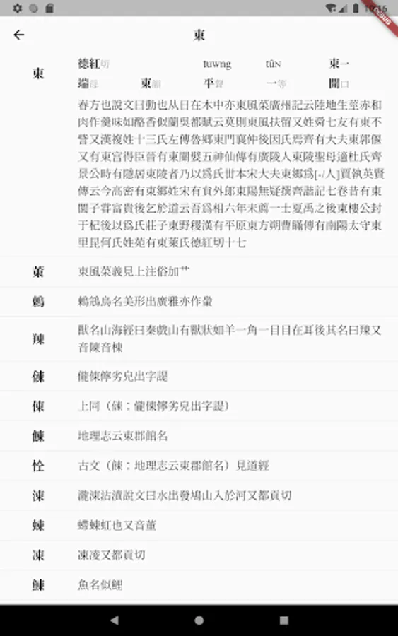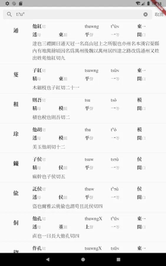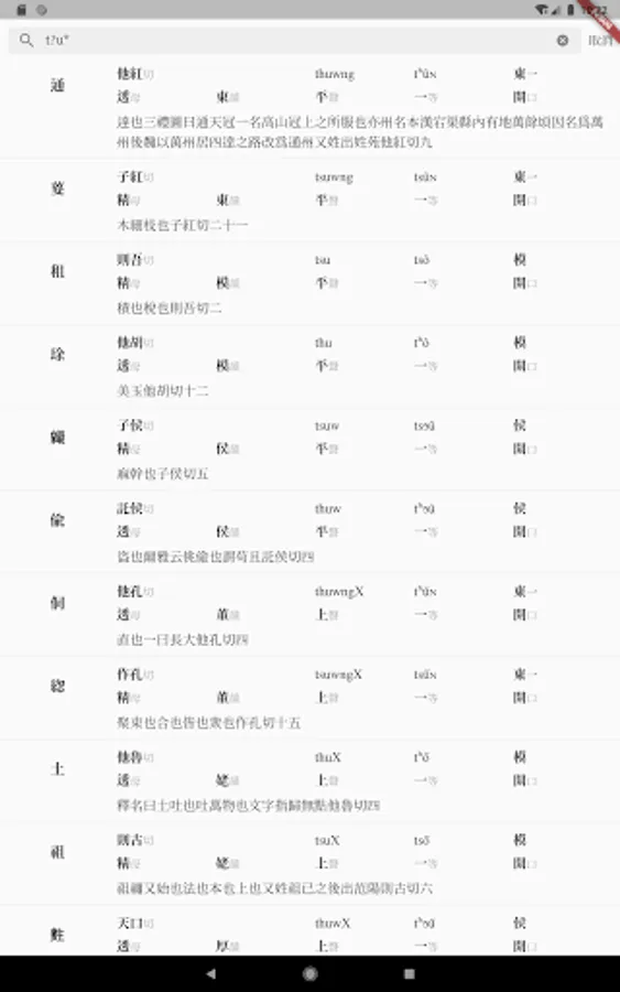 Yunjian supports the display of rare characters. In the Yunjian, you can read the entire book of "Guangyun" to inquire about the medieval phonology status of each character, and you can also search. Rhyme search supports simplified, traditional, variant, similar and semantically related characters, and also supports regular expression matching of Chinese Pinyin. It is a comprehensive "Guangyun" learning application.