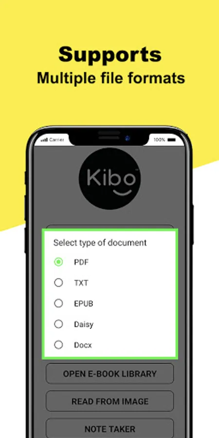Kibo provides an end-to-end content accessibility platform and makes reading-learning inclusive for all (including the blind, low-vision and visually-impaired people) while supporting 60+ international languages and 11 file-formats including PDF, TXT, EPUB, Daisy, DOCX, JPG, JPEG, PNG, MP3, OPUS, OGG. Not just that, you can use it as an audio player and even access over 1 Million+ books from our digital library partners.