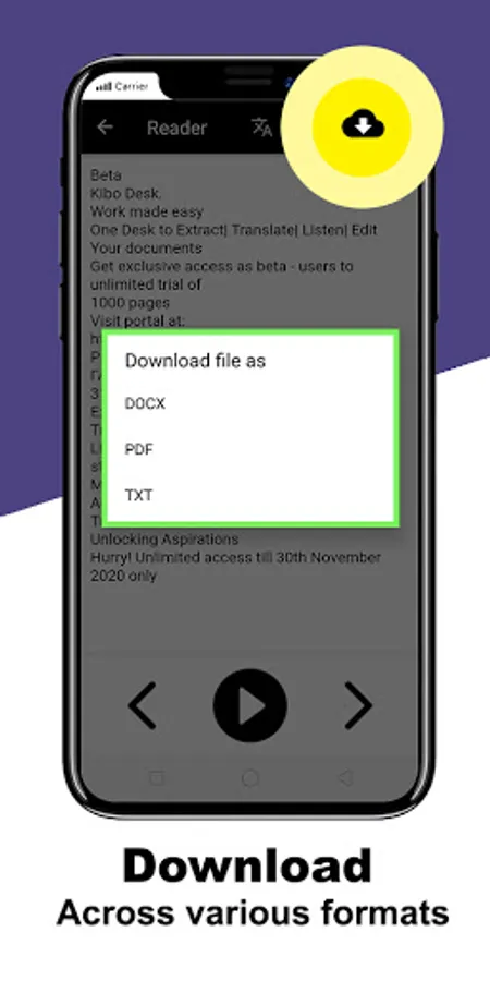 Listen to any printed, handwritten or digital content with Kibo; Translate them to the language of your choice or download them in editable formats like TXT, DOCX.
