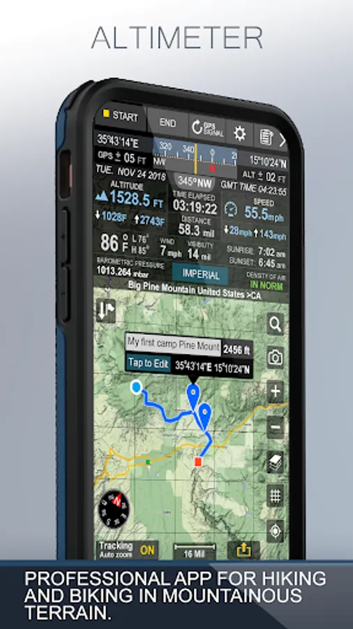 • Altitude, Time tracking, Tracking location on map, Ability to turn tracking off/on.