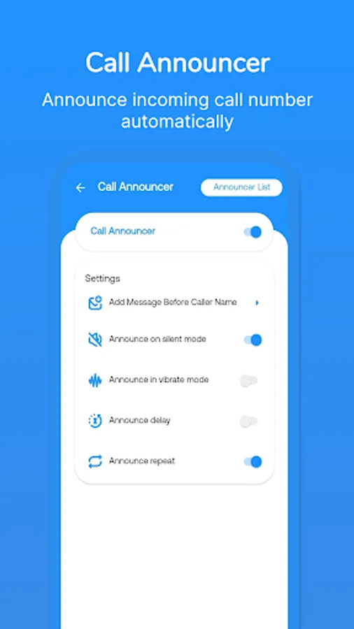 With caller name announcer, you quickly identify both the incoming caller name and SMS sender name in a variety of situations, such as while your phone is in your pocket or out of reach. Caller name announcer app announces the Caller Name, Unknown caller number, SMS, and announce the content of SMS. Not just that, Caller Name Announcer can read WA Chats and calls easily. Call announcer program - smart dialer assists you by reading out loud the message's contents.
