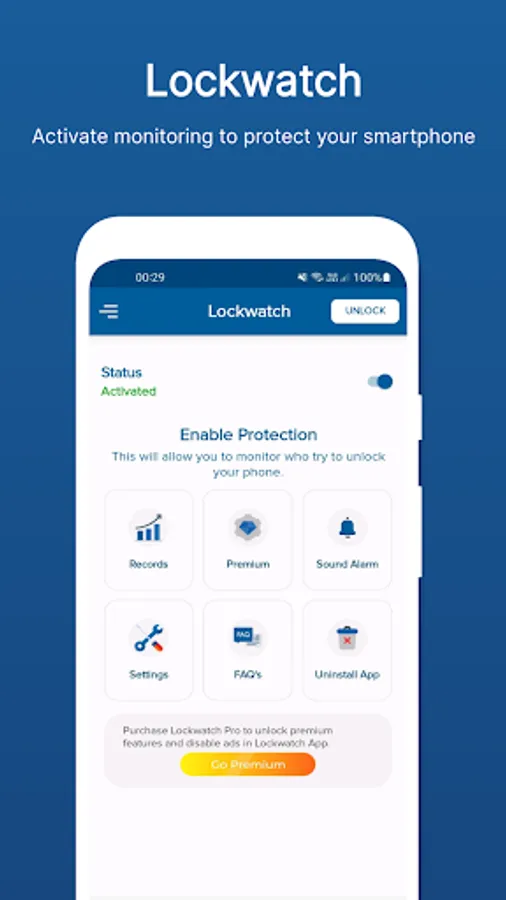 • Lockwatch helps you to protect your app with Pin, Pattern or Fingerprint features provided with in app settings so no one can delete or access your app.