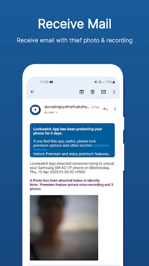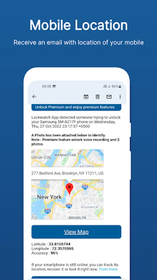 • Send email with Photo, GPS Coordinates, Accuracy of distance, Map Link to locate thief and much more.