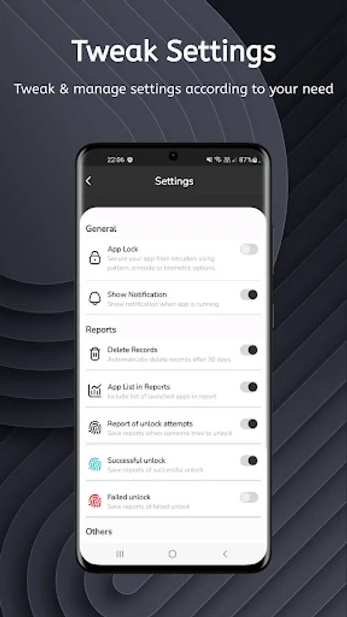 • Work with built-in lock screen to monitor wrong pin, password or pattern lock.