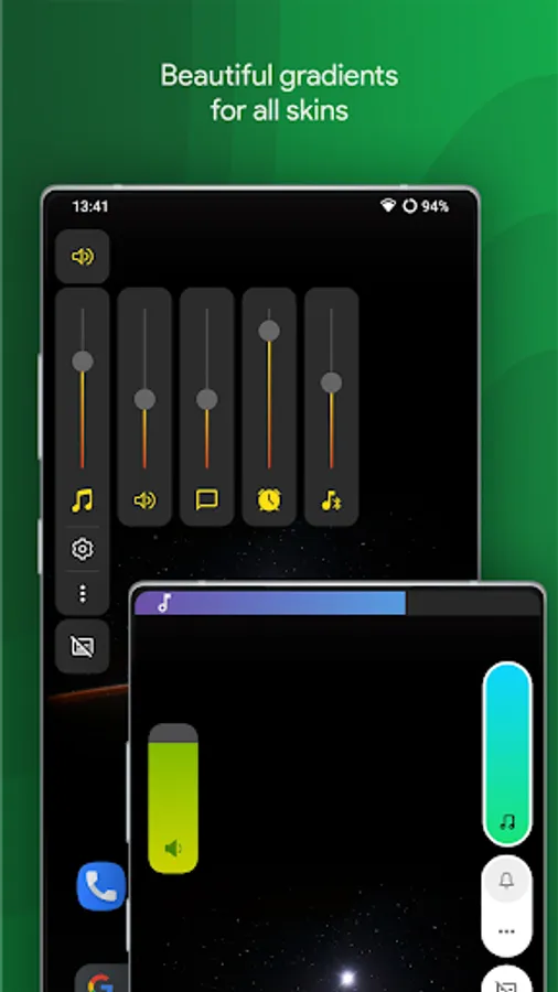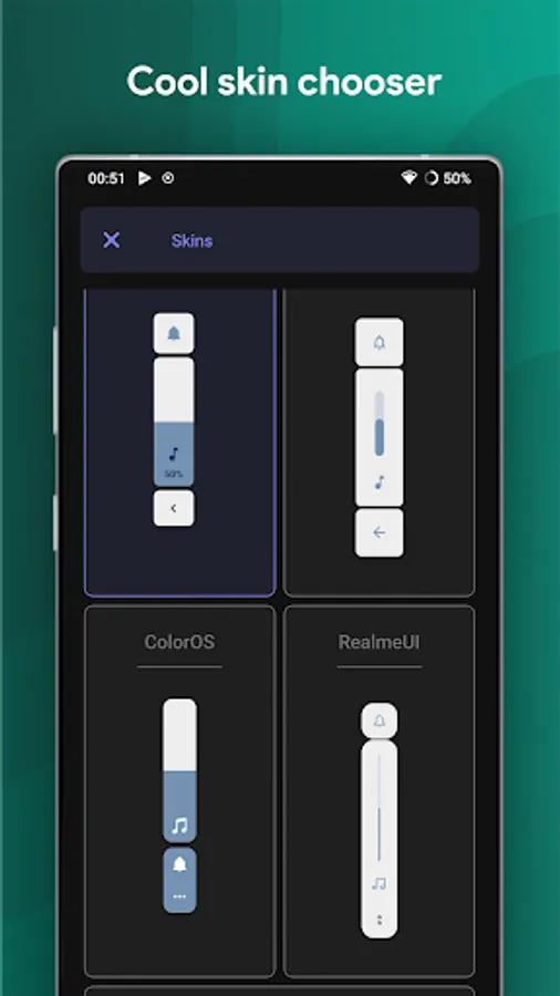 Chose from a variety of different skins and create a beautiful volume control panel on your phone in a few seconds!