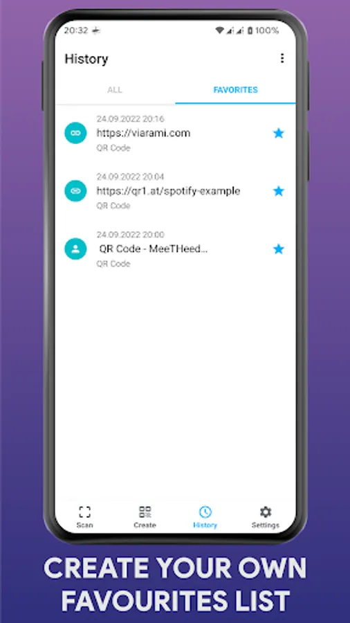 QR Scanner app helps you creating QR codes anytime in multiple formats, Weblink, Text, etc. By inputting the information and tap "create" button, you can create your own QR code quickly.