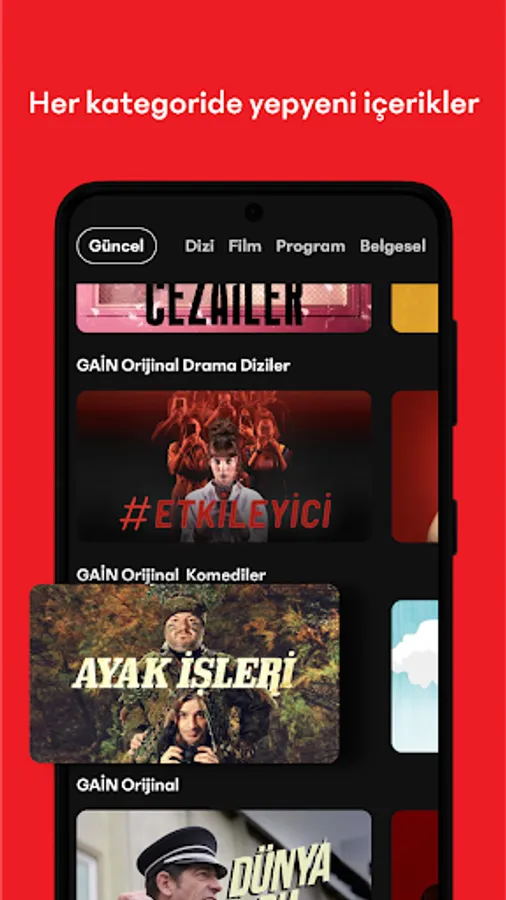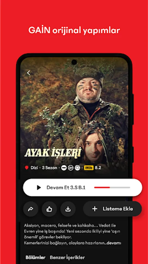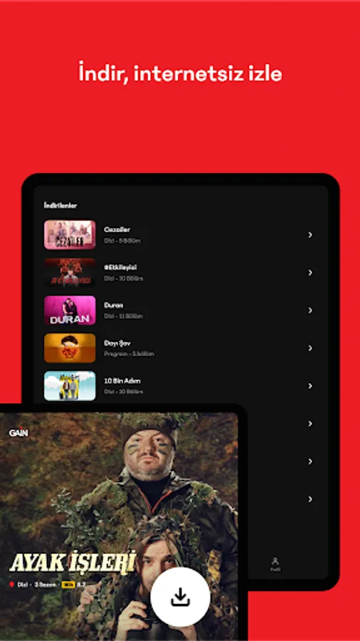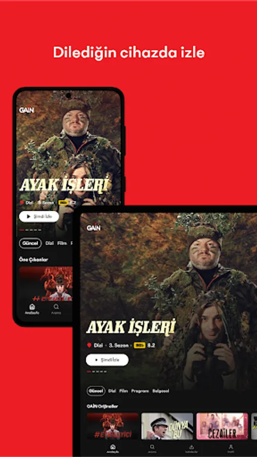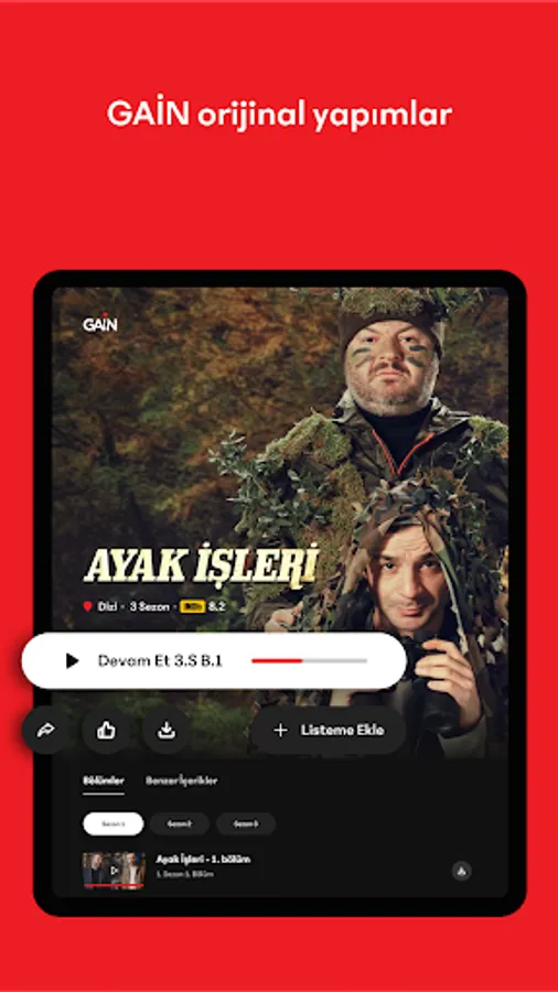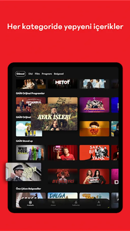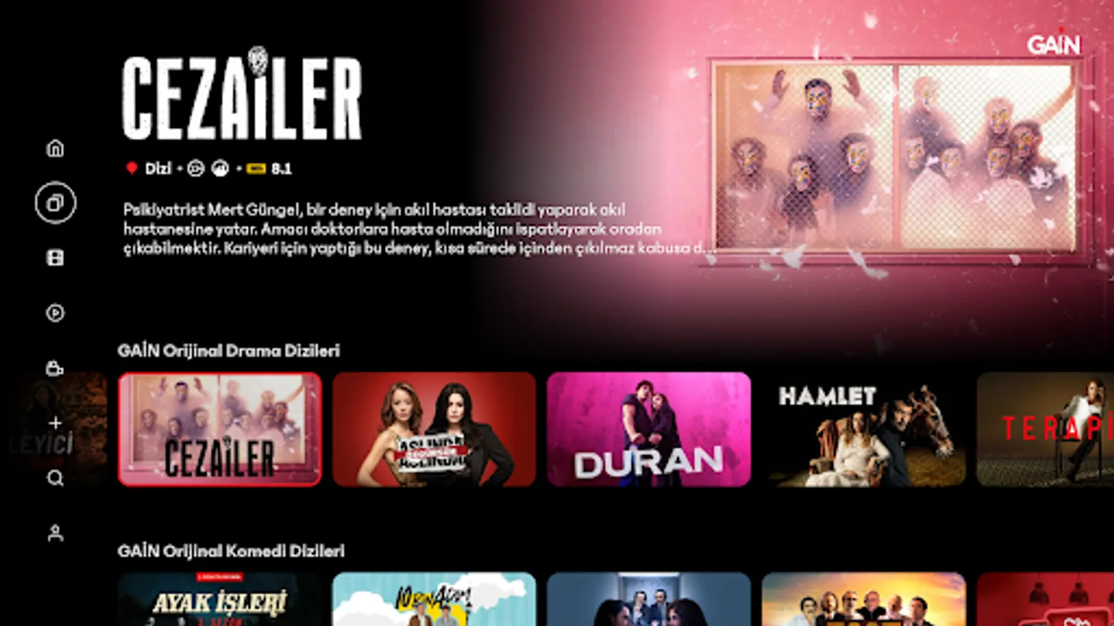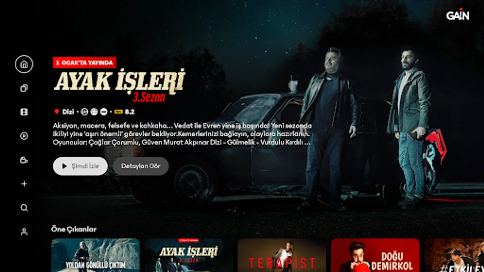GAIN is one of Turkey's leading digital broadcasting platforms. He is famous for his AYAK İŞLERİ series, one of Turkey's most popular comedy series. GAIN has a wide range of content to appeal to users with different perspectives and diverse interests. It offers a rich entertainment experience to its users who want to spend quality time with domestic and foreign content. It also includes series, movies, documentaries, stand-up shows and entertainment programs. This is the World, 10 Thousand Steps, Hamlet, Duran, Moderate Love, You Are Actually Free, Impressive, Mirgün Cabas - Live News, Duygu Demirdağ - Live News, Uncle Show, Criminals, Locksmith's Table, Age Fire, Check, BKM Kitchen, TuzBiber You can also find popular content such as Istanbul Account, Istanbul Apartments, etc. on the platform.
