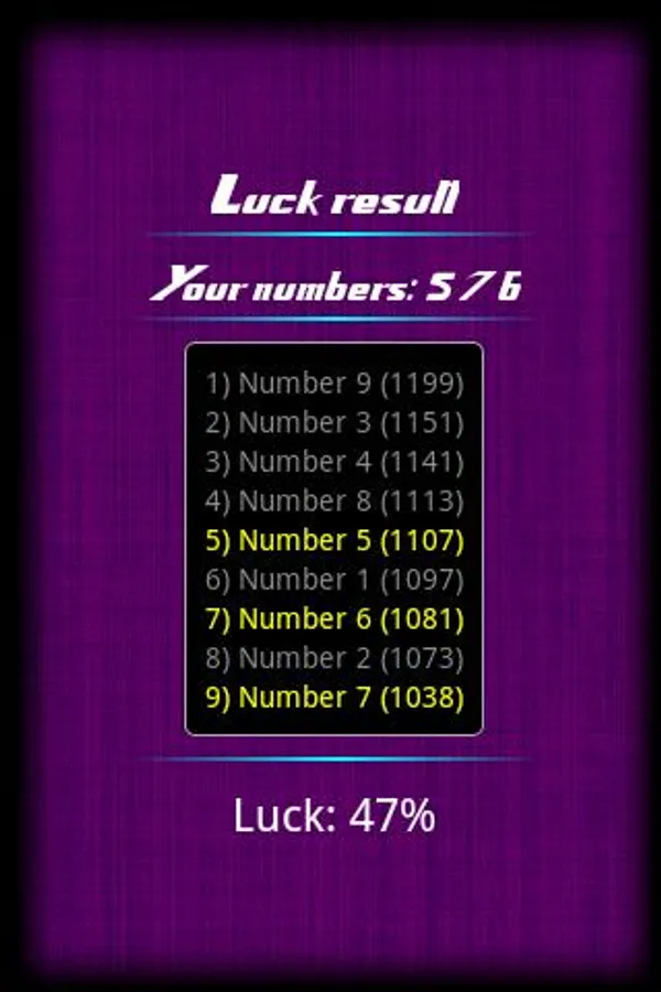 This application helps you determine how lucky you are right now using a simple algorithm: you choose 3 numbers between 1 and 10 and then the application randomly generates 1000 numbers and counts them. If the 3 numbers you have selected are the top 3 most generated numbers then you get 100% percent luck! For the last 3 positions, the luck percent is 0.