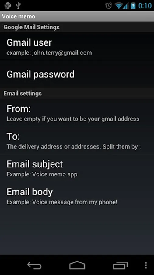 A simple and fast application to send voice emails. Just after you push "Stop" button, an email with the voice message attached it's sent to your desired address (or addresses) or if you don't have internet connection they will be send as soon as it becomes available.