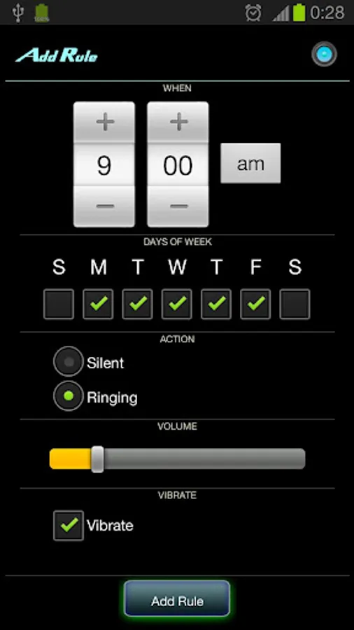 Simply add rules that will turn the phone state to silent, vibrate or ringing with a specific volume at a certain time in certain days of the week.
