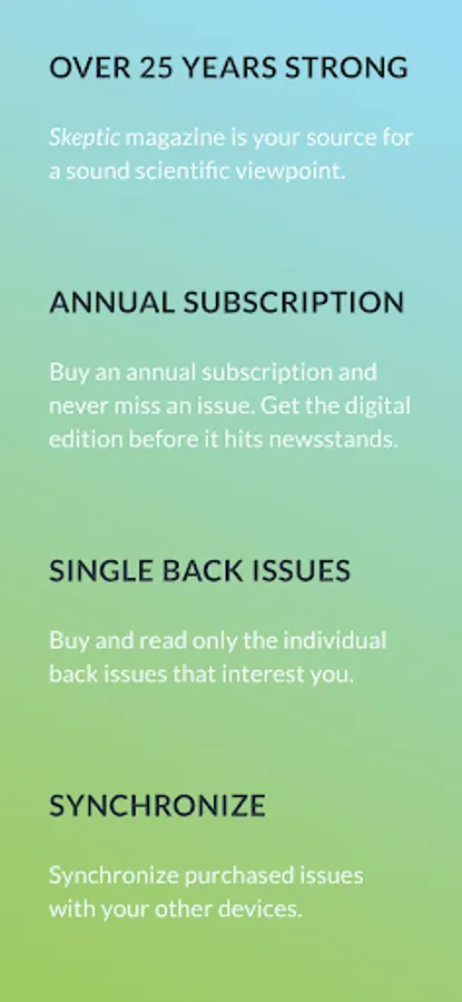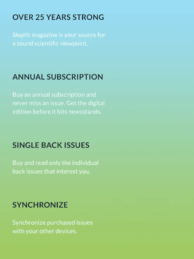Whether you're at home or on the go, the Skeptic App is the easiest way to access your favorite articles. Proven to be a great conversation starter for those who choose not to see the world in black and white.